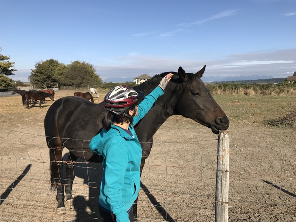 As long as I'd ridden with Hillary, going past horses was an invitation to stop for a break. Or at least roll very slowly for a while. On this ride, we stopped and she chatted at them for a bit. One wandered over and chewed contentedly (I assume) on the fencepost while Hillary talked and patted for several minutes.